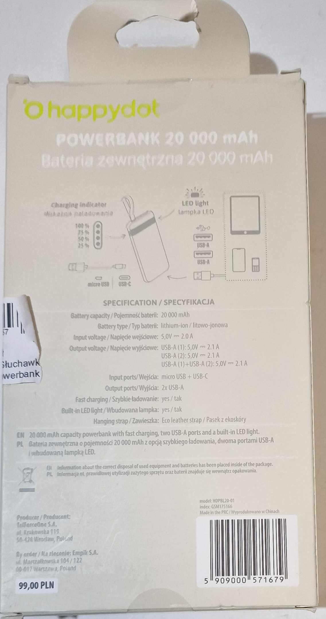 W sprzedaży posiadamy używany powerbank happy dot 20000mAh.